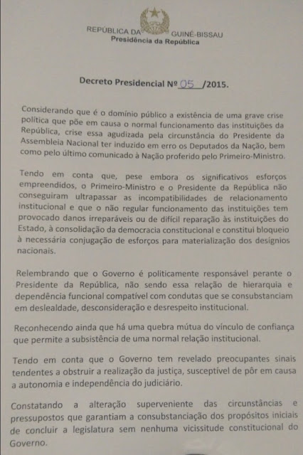Duas horas e meia antes o chefe de estado fez um discurso à nação dizendo que uma remodelação governamental não chegava para resolver a crise política no país. Às 23h10 locais “é demitido o governo chefiado por Domingos Simões Pereira”, refere-se no único artigo do decreto presidencial.
